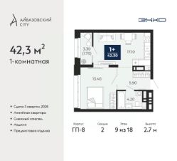 Продается 1-комн. квартира с предчистовой отделкой в ЖК "Айвазовский City" на 9 этаже. Общая площадь: 42.3 кв.м., жилая: 13.4 кв.м., площадь просторной кухни-столовой: 17.1 кв.м. Все окна выходят на одну сторону. В квартире одна лоджия, один совмещенный санузел. Высота потолков 2.7 м.