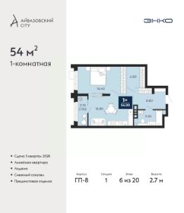 1-комн. квартира с предчистовой отделкой в ЖК "Айвазовский City" на 6 этаже. Общая площадь: 54 кв.м., жилая: 16.4 кв.м., площадь просторной кухни-столовой: 16.8 кв.м. Все окна выходят на одну сторону. В квартире одна лоджия, один совмещенный санузел. Высота потолков 2.7 м.