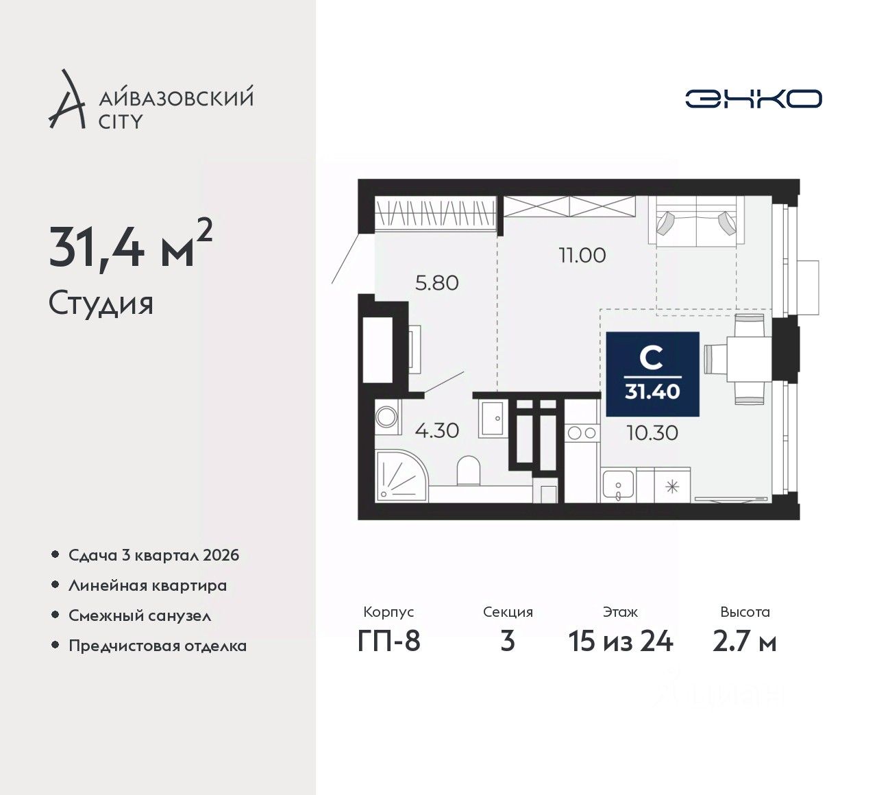 1-комн. квартира-студия с предчистовой отделкой в ЖК "Айвазовский City" на 15 этаже. Общая площадь: 31.4 кв.м., площадь гостиной 21.3 кв.м., из которых 10.3 кв.м. выделено под кухонную зону. Все окна выходят на одну сторону. В квартире один совмещенный санузел. Высота потолков 2.7 м.