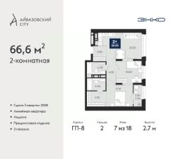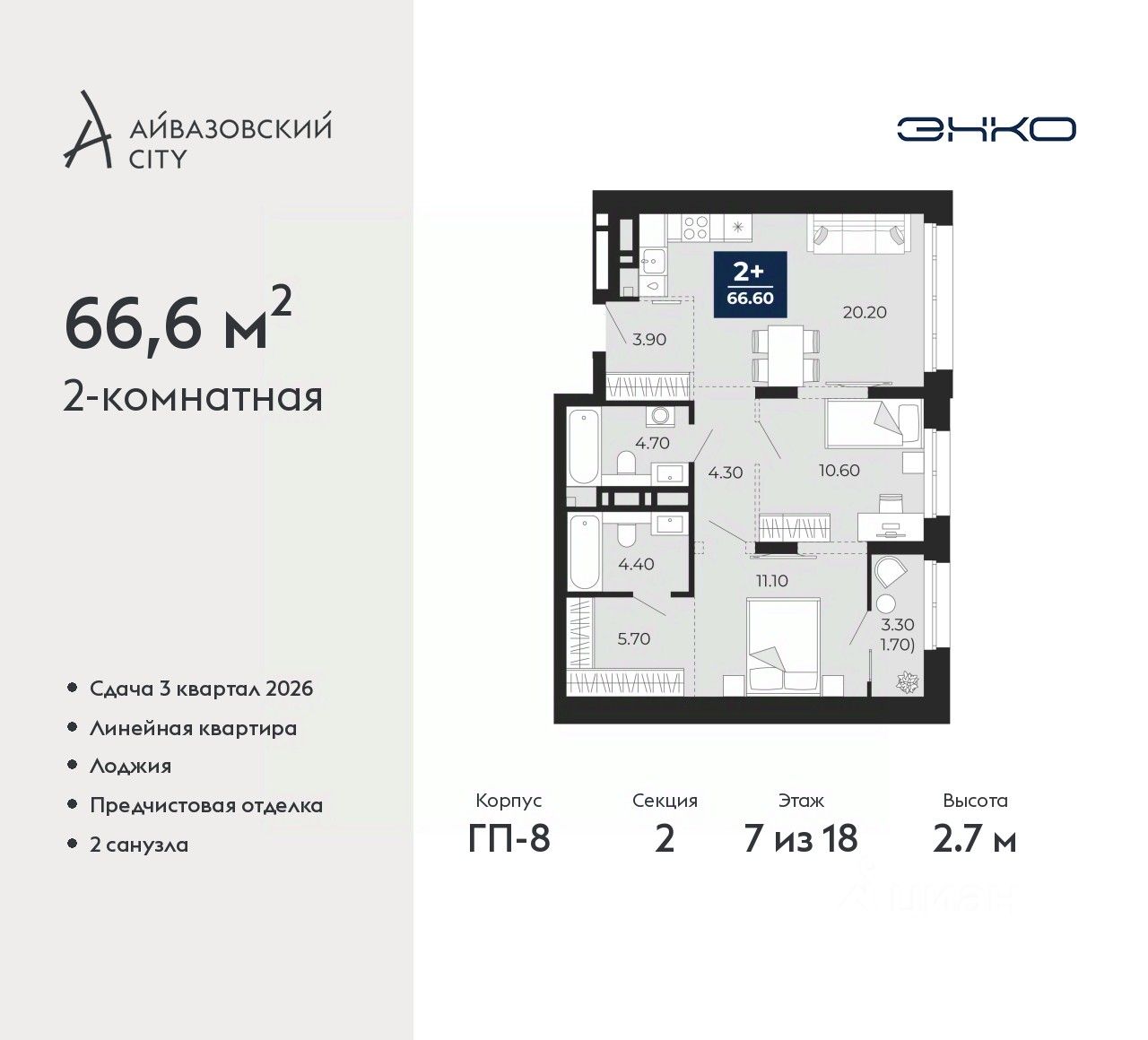 Продается 2-комн. квартира с предчистовой отделкой в ЖК "Айвазовский City" на 7 этаже. Общая площадь: 66.6 кв.м., жилая: 21.7 кв.м., площадь просторной кухни-столовой: 20.2 кв.м. Комнаты изолированные, все окна выходят на одну сторону. В квартире одна лоджия, два совмещенных санузла. Высота потолков 2.7 м.