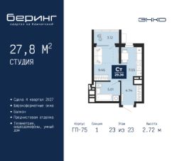 Продается 1-комн. квартира-студия с предчистовой отделкой в ЖК "Беринг" на 23 этаже. Общая площадь: 27.8 кв.м., площадь гостиной 16.49 кв.м., из которых 7.03 кв.м. выделено под кухонную зону. Все окна выходят на одну сторону. В квартире один балкон, один совмещенный санузел. Высота потолков 2.72 м.