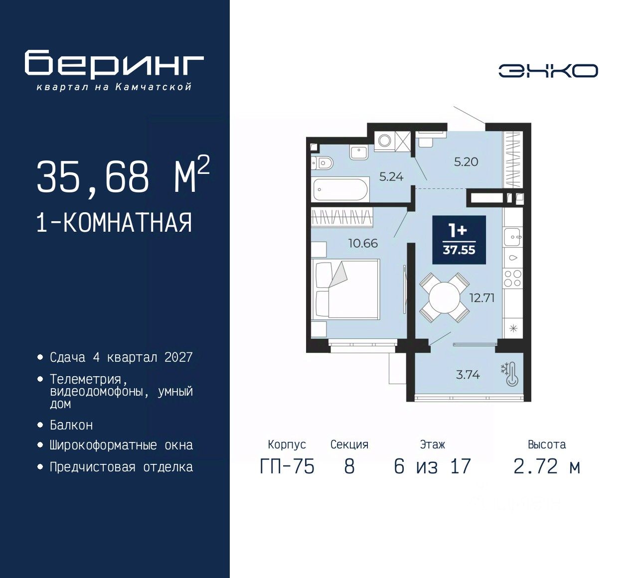 Просторная 1-комн. квартира с предчистовой отделкой в ЖК "Беринг" на 6 этаже. Общая площадь: 35.68 кв.м., жилая: 10.66 кв.м., площадь просторной кухни-столовой: 12.71 кв.м. Все окна выходят на одну сторону. В квартире один балкон, один совмещенный санузел. Высота потолков 2.72 м.