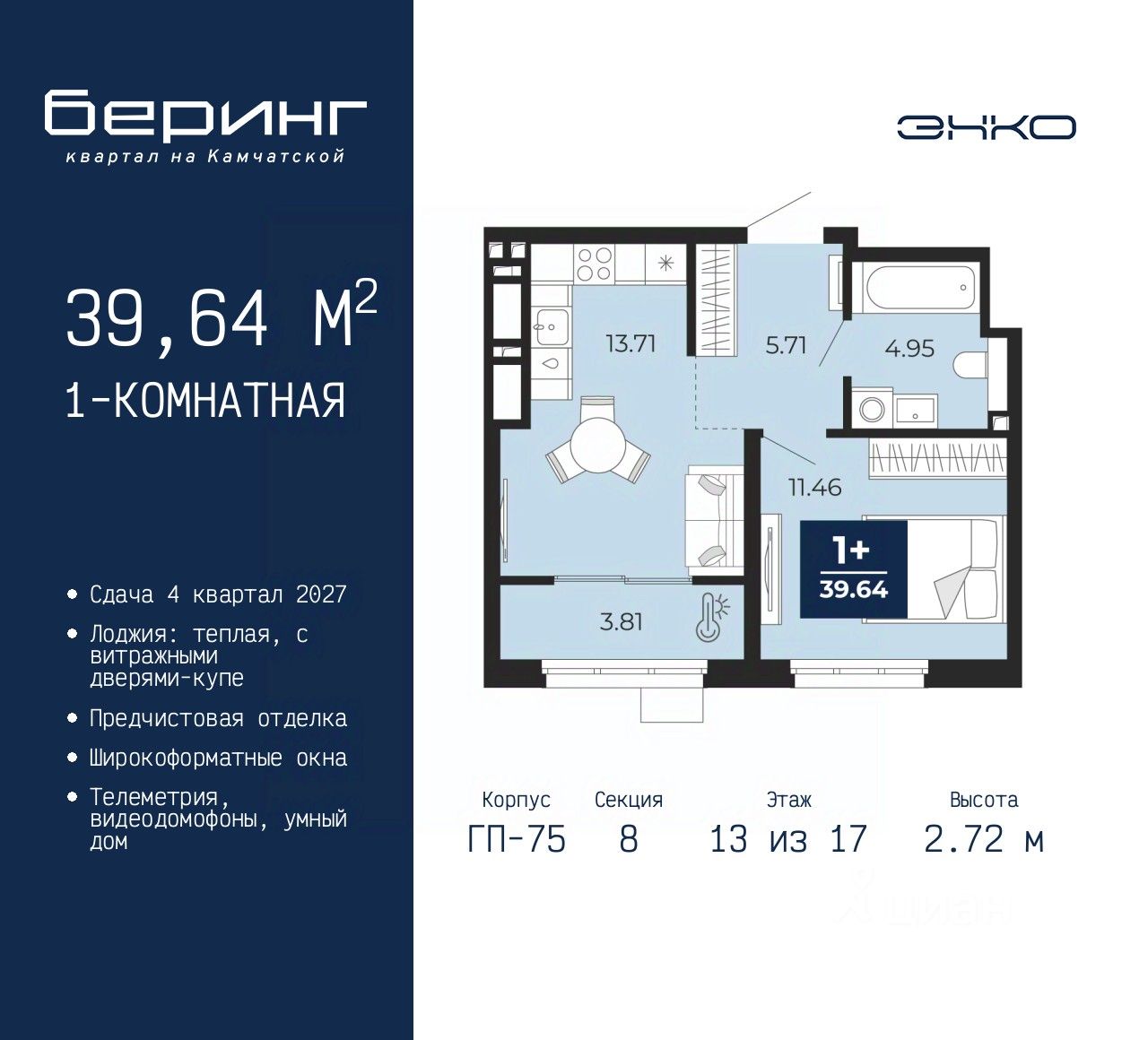 Продается 1-комн. квартира от застройщика с предчистовой отделкой в ЖК "Беринг" на 13 этаже. Общая площадь: 39.64 кв.м., жилая: 11.46 кв.м., площадь просторной кухни-столовой: 13.71 кв.м. Все окна выходят на одну сторону. В квартире одна лоджия, один совмещенный санузел. Высота потолков 2.72 м.