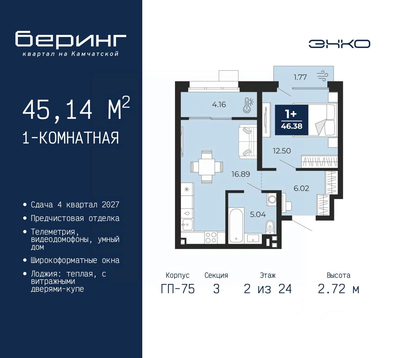 Продается 1-комн. квартира с предчистовой отделкой в ЖК "Беринг" на 2 этаже. Общая площадь: 45.14 кв.м., жилая: 12.5 кв.м., площадь просторной кухни-столовой: 16.89 кв.м. Все окна выходят на одну сторону. В квартире один балкон и одна лоджия, один совмещенный санузел. Высота потолков 2.72 м.