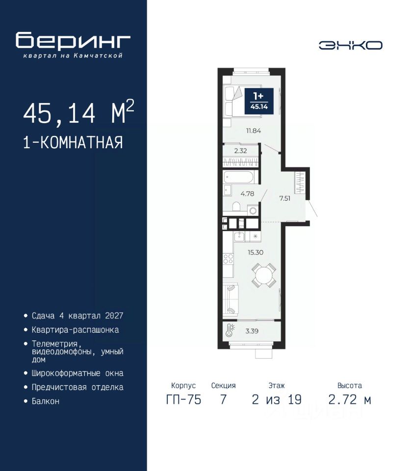 1-комн. квартира с предчистовой отделкой в ЖК "Беринг" на 2 этаже. Общая площадь: 45.14 кв.м., жилая: 11.84 кв.м., площадь просторной кухни-столовой: 15.3 кв.м. Квартира - распашонка, без проходных комнат, окна выходят на paзные стороны дома. В квартире один балкон, один совмещенный санузел. Высота потолков 2.72 м.