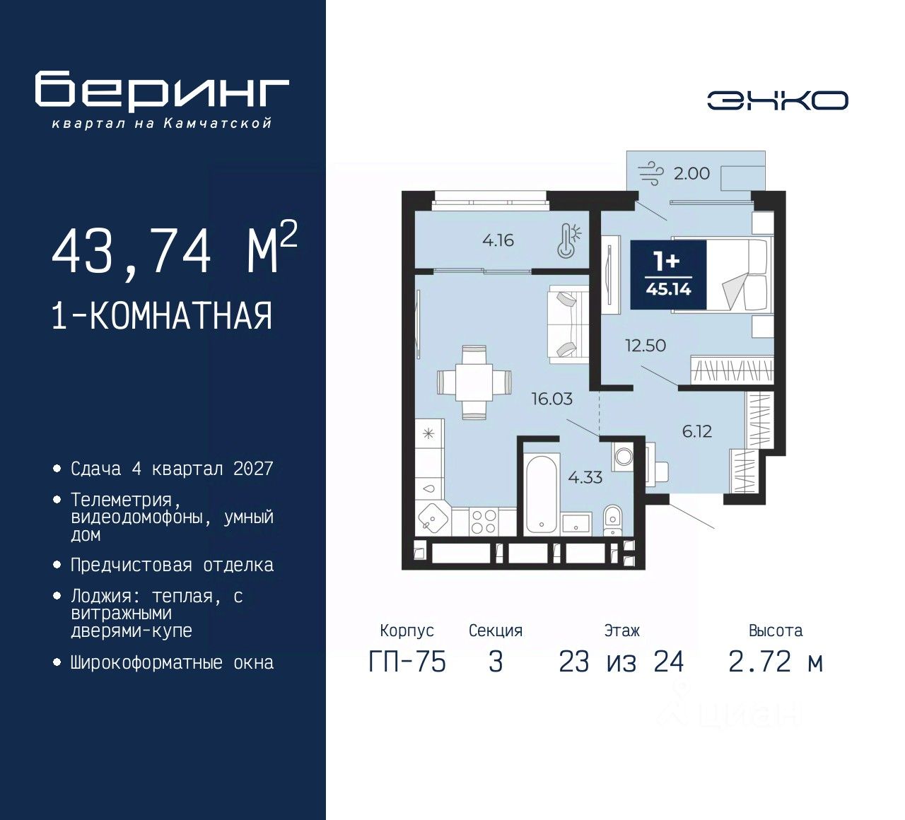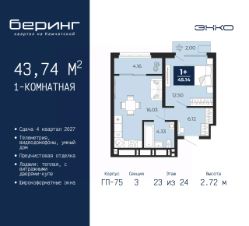 Однокомнатная квартира с предчистовой отделкой в ЖК "Беринг" на 23 этаже. Общая площадь: 43.74 кв.м., жилая: 12.5 кв.м., площадь просторной кухни-столовой: 16.03 кв.м. Все окна выходят на одну сторону. В квартире один балкон и одна лоджия, один совмещенный санузел. Высота потолков 2.72 м.