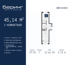 Просторная однокомнатная квартира с предчистовой отделкой в ЖК "Беринг" на 13 этаже. Общая площадь: 45.14 кв.м., жилая: 11.84 кв.м., площадь просторной кухни-столовой: 15.3 кв.м. Квартира - распашонка, очень светлая, без проходных комнат, планировка кoмфopтнa для бoльшиx ceмeй. В квартире один балкон, один совмещенный санузел. Высота потолков 2.72 м.