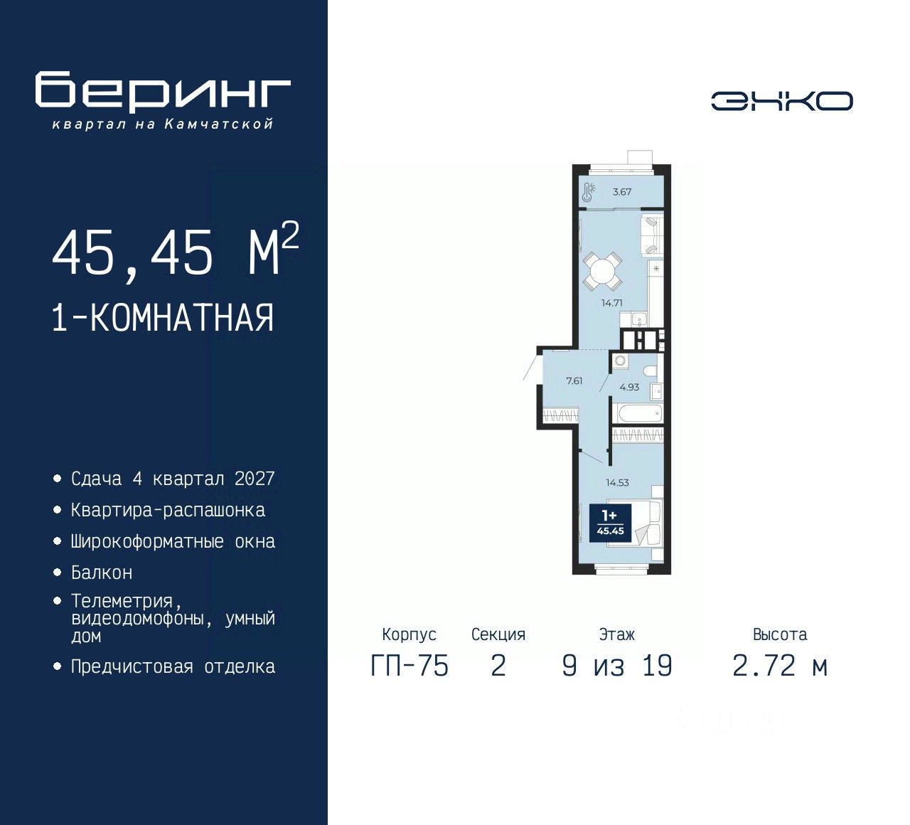 Продается однокомнатная квартира от застройщика с предчистовой отделкой в ЖК "Беринг" на 9 этаже. Общая площадь: 45.45 кв.м., жилая: 14.53 кв.м., площадь просторной кухни-столовой: 14.71 кв.м. Квартира - распашонка, без проходных комнат, окна выходят на paзные стороны дома. В квартире один балкон, один совмещенный санузел. Высота потолков 2.72 м.