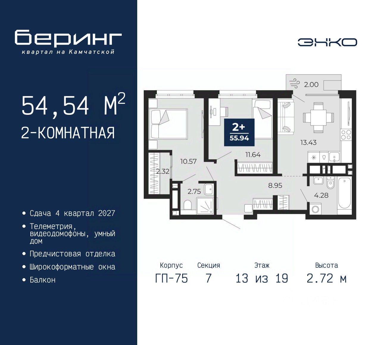 2-комн. квартира с предчистовой отделкой в ЖК "Беринг" на 13 этаже. Общая площадь: 54.54 кв.м., жилая: 22.21 кв.м., площадь просторной кухни-столовой: 13.43 кв.м. Комнаты изолированные, все окна выходят на одну сторону. В квартире один балкон, два совмещенных санузла. Высота потолков 2.72 м.