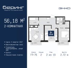 Просторная 2-комн. квартира с предчистовой отделкой в ЖК "Беринг" на 2 этаже. Общая площадь: 56.18 кв.м., жилая: 24.45 кв.м., площадь просторной кухни-столовой: 13.39 кв.м. Комнаты изолированные, все окна выходят на одну сторону. В квартире два балкона, два совмещенных санузла. Высота потолков 2.72 м.