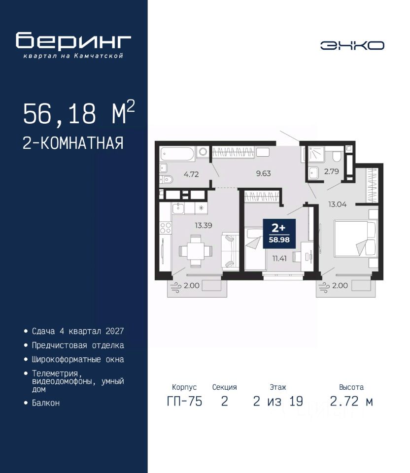 Двухкомнатная квартира от застройщика с предчистовой отделкой в ЖК "Беринг" на 2 этаже. Общая площадь: 56.18 кв.м., жилая: 24.45 кв.м., площадь просторной кухни-столовой: 13.39 кв.м. Комнаты изолированные, все окна выходят на одну сторону. В квартире два балкона, два совмещенных санузла. Высота потолков 2.72 м.