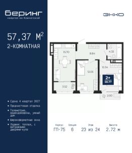 Двухкомнатная квартира с предчистовой отделкой в ЖК "Беринг" на 23 этаже. Общая площадь: 57.37 кв.м., жилая: 24.39 кв.м., площадь просторной кухни-столовой: 15.7 кв.м. Комнаты изолированные, все окна выходят на одну сторону. В квартире один балкон и одна лоджия, один совмещенный санузел. Высота потолков 2.72 м.