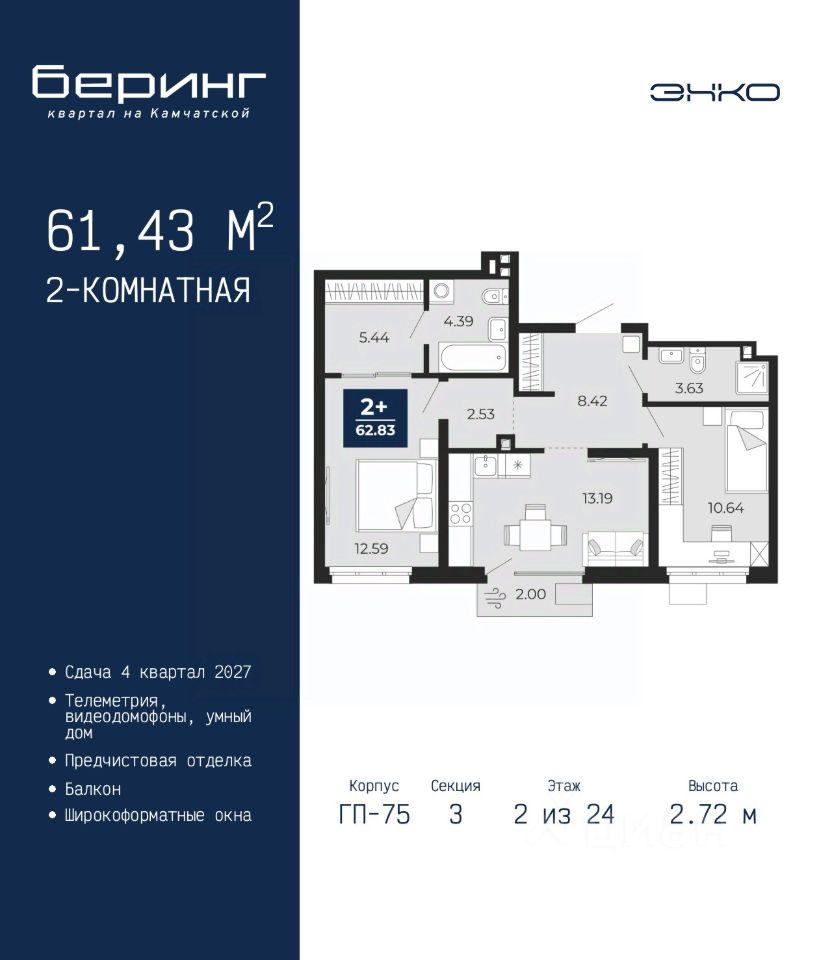 2-комн. квартира от застройщика с предчистовой отделкой в ЖК "Беринг" на 2 этаже. Общая площадь: 61.43 кв.м., жилая: 23.23 кв.м., площадь просторной кухни-столовой: 13.19 кв.м. Комнаты изолированные, все окна выходят на одну сторону. В квартире один балкон, два совмещенных санузла. Высота потолков 2.72 м.