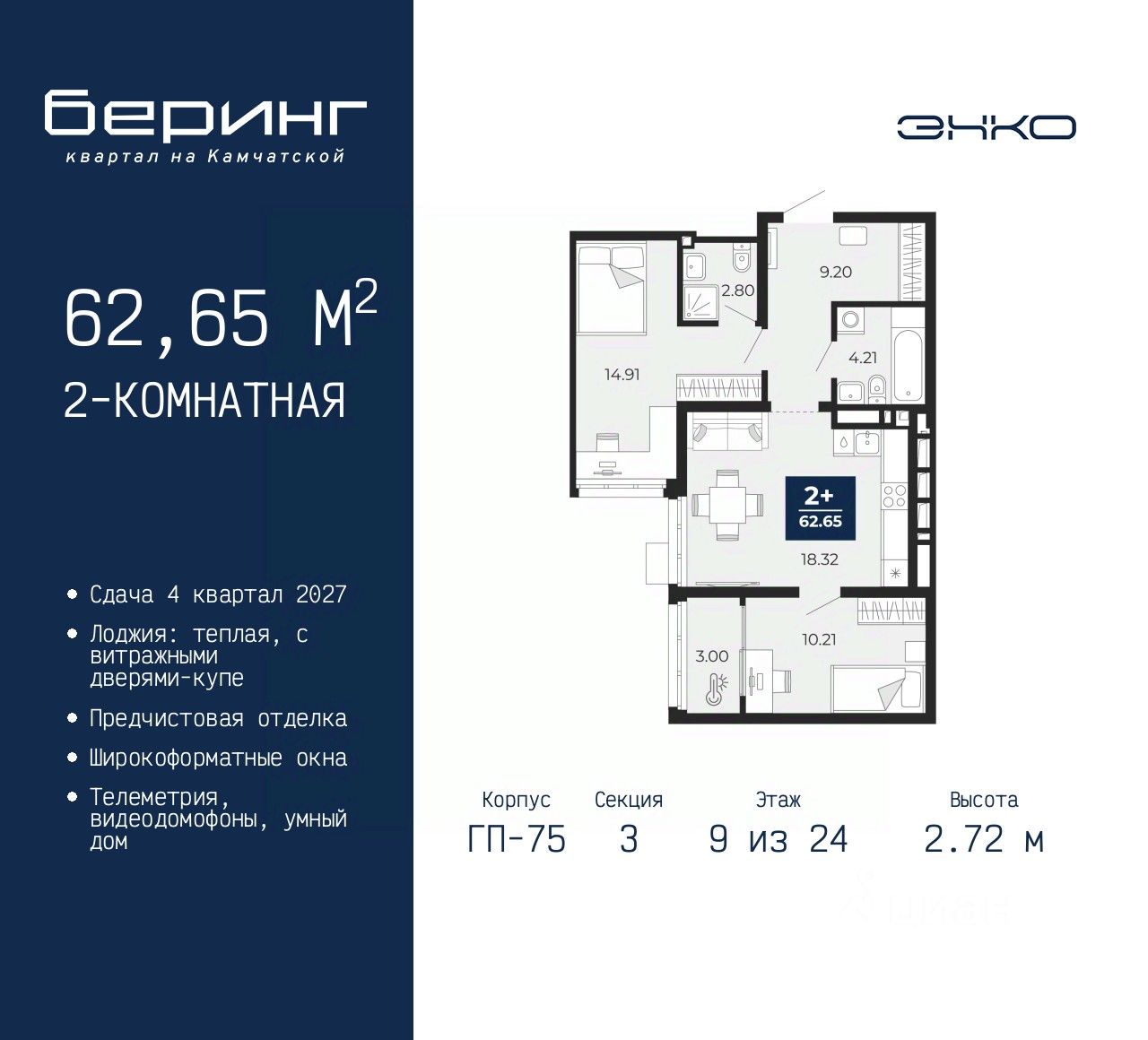 Двухкомнатная квартира с предчистовой отделкой в ЖК "Беринг" на 9 этаже. Общая площадь: 62.65 кв.м., жилая: 25.12 кв.м., площадь просторной кухни-столовой: 18.32 кв.м. Комнаты изолированные, все окна выходят на одну сторону. В квартире одна лоджия, два совмещенных санузла. Высота потолков 2.72 м.