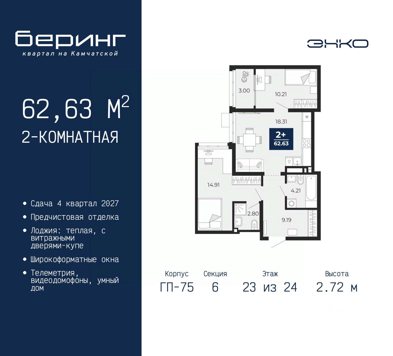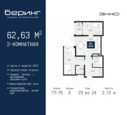 Продается 2-комн. квартира с предчистовой отделкой в ЖК "Беринг" на 23 этаже. Общая площадь: 62.63 кв.м., жилая: 25.12 кв.м., площадь просторной кухни-столовой: 18.31 кв.м. Комнаты изолированные, все окна выходят на одну сторону. В квартире одна лоджия, два совмещенных санузла. Высота потолков 2.72 м.