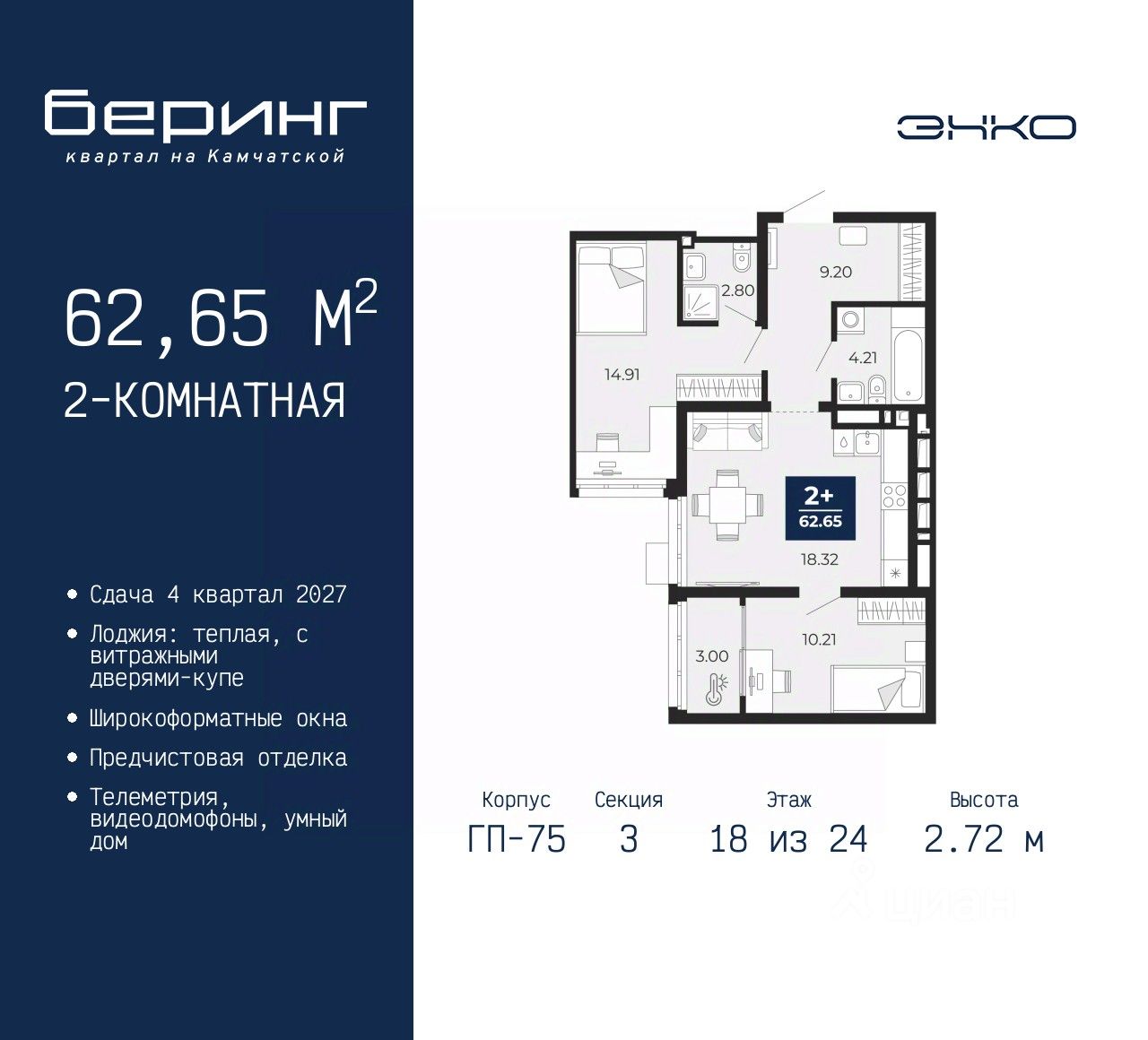 Продается 2-комн. квартира с предчистовой отделкой в ЖК "Беринг" на 18 этаже. Общая площадь: 62.65 кв.м., жилая: 25.12 кв.м., площадь просторной кухни-столовой: 18.32 кв.м. Комнаты изолированные, все окна выходят на одну сторону. В квартире одна лоджия, два совмещенных санузла. Высота потолков 2.72 м.