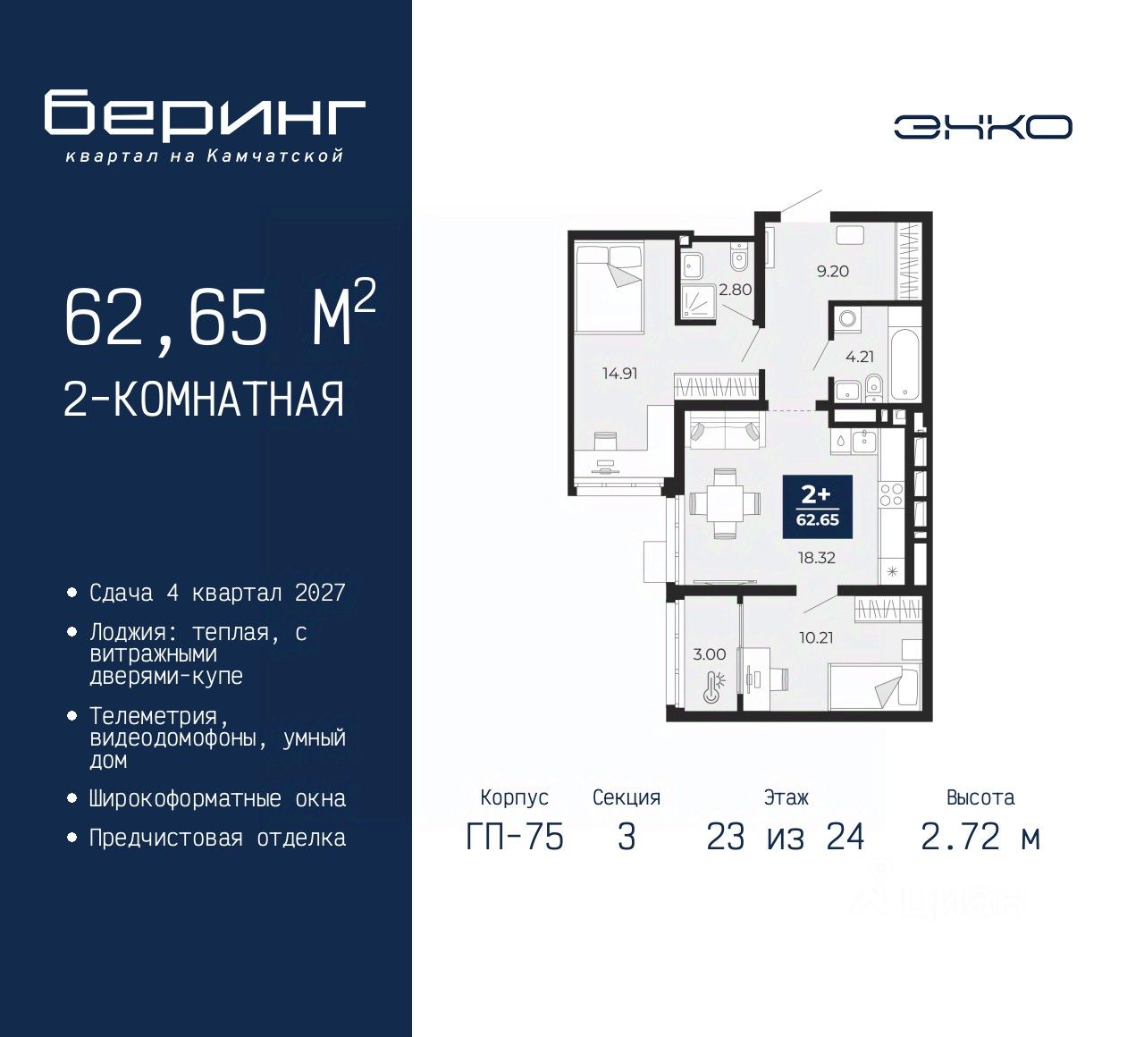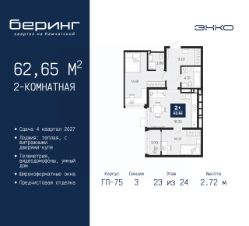 Двухкомнатная квартира с предчистовой отделкой в ЖК "Беринг" на 23 этаже. Общая площадь: 62.65 кв.м., жилая: 25.12 кв.м., площадь просторной кухни-столовой: 18.32 кв.м. Комнаты изолированные, все окна выходят на одну сторону. В квартире одна лоджия, два совмещенных санузла. Высота потолков 2.72 м.