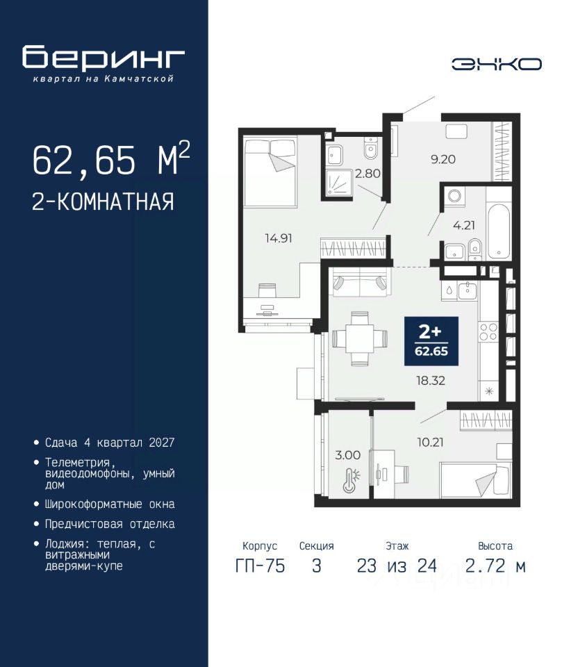 Продается 2-комн. квартира с предчистовой отделкой в ЖК "Беринг" на 23 этаже. Общая площадь: 62.65 кв.м., жилая: 25.12 кв.м., площадь просторной кухни-столовой: 18.32 кв.м. Комнаты изолированные, все окна выходят на одну сторону. В квартире одна лоджия, два совмещенных санузла. Высота потолков 2.72 м.