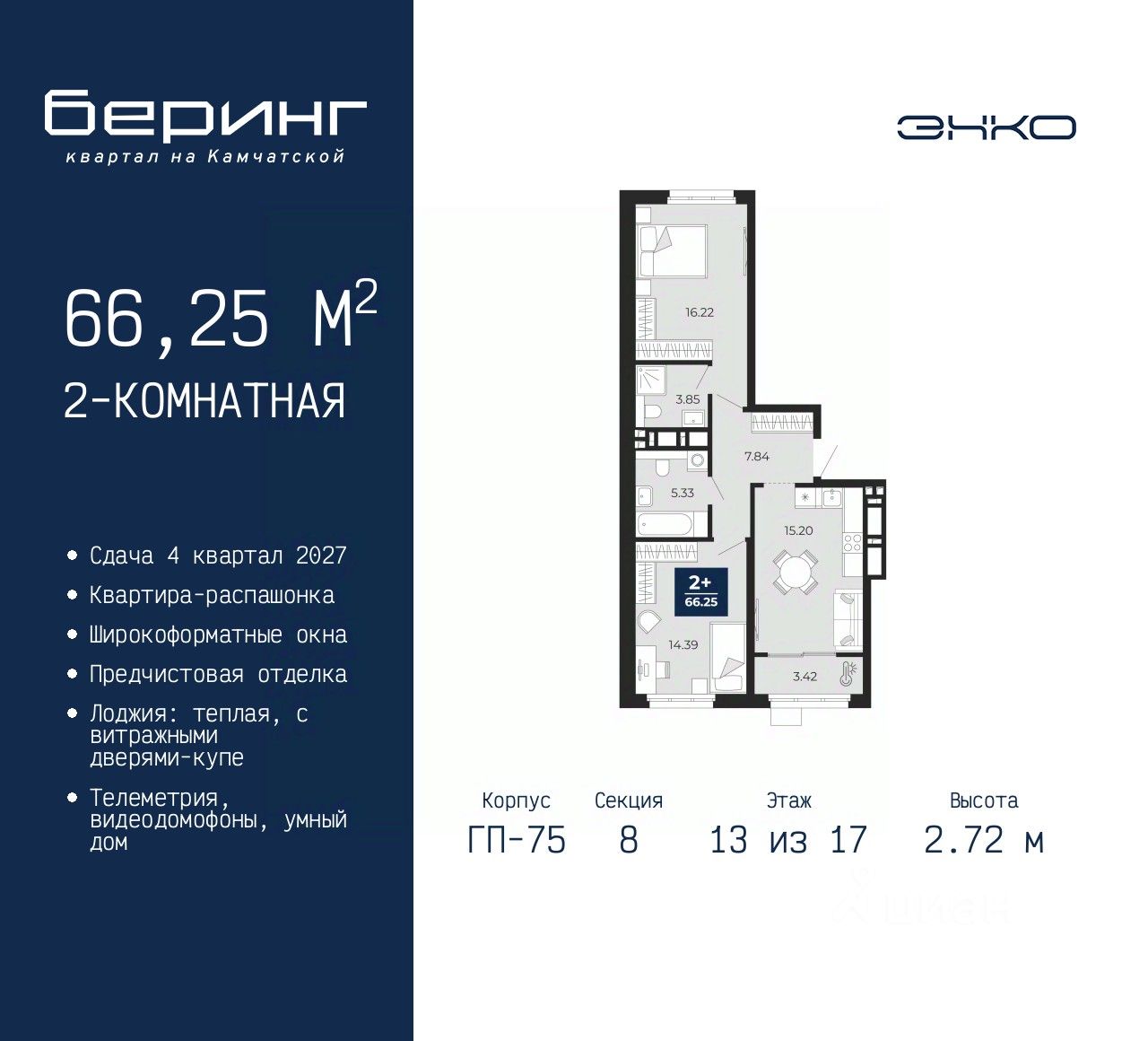 2-комн. квартира от застройщика с предчистовой отделкой в ЖК "Беринг" на 13 этаже. Общая площадь: 66.25 кв.м., жилая: 30.61 кв.м., площадь просторной кухни-столовой: 15.2 кв.м. Квартира - распашонка, без проходных комнат, окна выходят на paзные стороны дома. В квартире одна лоджия, два совмещенных санузла. Высота потолков 2.72 м.