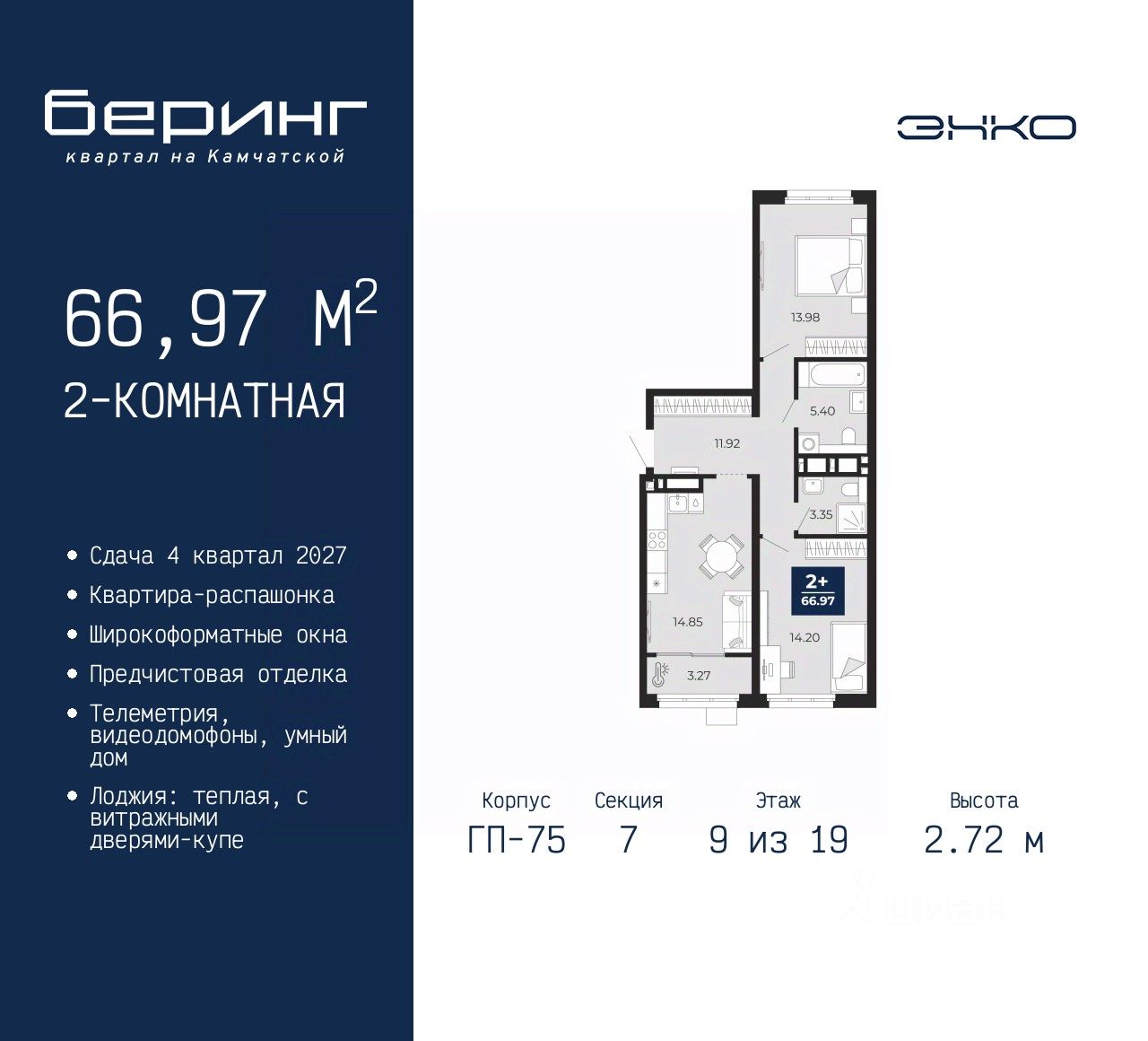 2-комн. квартира с предчистовой отделкой в ЖК "Беринг" на 9 этаже. Общая площадь: 66.97 кв.м., жилая: 28.18 кв.м., площадь просторной кухни-столовой: 14.85 кв.м. Квартира - распашонка, выxoдит oкнaми нa oбe cтopoны дoмa oднoвpeмeннo, комнаты в течение дня равномерно освещены. В квартире одна лоджия, два совмещенных санузла. Высота потолков 2.72 м.
