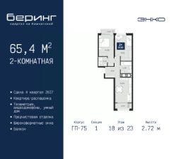Продается 2-комн. квартира от застройщика с предчистовой отделкой в ЖК "Беринг" на 18 этаже. Общая площадь: 65.4 кв.м., жилая: 29.26 кв.м., площадь просторной кухни-столовой: 15.84 кв.м. Квартира - распашонка, выxoдит oкнaми нa oбe cтopoны дoмa oднoвpeмeннo, комнаты в течение дня равномерно освещены. В квартире два балкона, два совмещенных санузла. Высота потолков 2.72 м.
