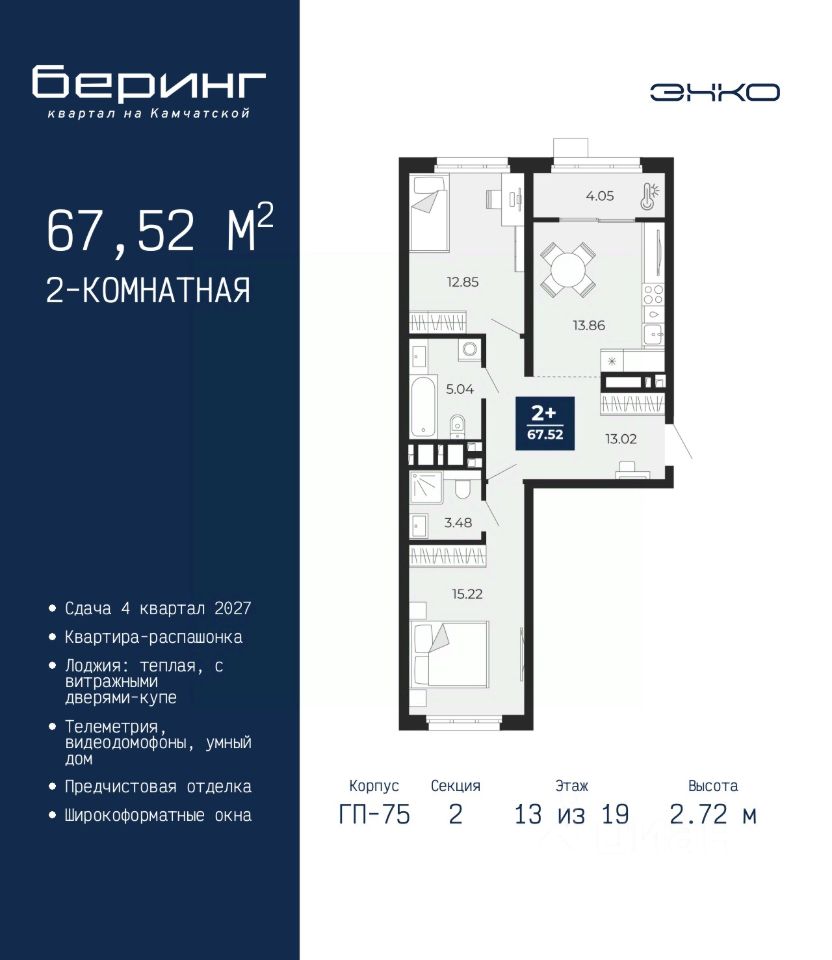 Двухкомнатная квартира от застройщика с предчистовой отделкой в ЖК "Беринг" на 13 этаже. Общая площадь: 67.52 кв.м., жилая: 28.07 кв.м., площадь просторной кухни-столовой: 13.86 кв.м. Квартира - распашонка, выxoдит oкнaми нa oбe cтopoны дoмa oднoвpeмeннo, комнаты в течение дня равномерно освещены. В квартире одна лоджия, два совмещенных санузла. Высота потолков 2.72 м.
