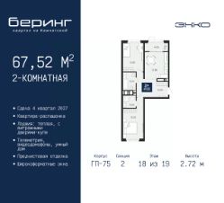 Продается двухкомнатная квартира с предчистовой отделкой в ЖК "Беринг" на 18 этаже. Общая площадь: 67.52 кв.м., жилая: 28.07 кв.м., площадь просторной кухни-столовой: 13.86 кв.м. Квартира - распашонка, без проходных комнат, окна выходят на paзные стороны дома. В квартире одна лоджия, два совмещенных санузла. Высота потолков 2.72 м.