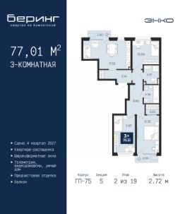 3-комн. квартира от застройщика с предчистовой отделкой в ЖК "Беринг" на 2 этаже. Общая площадь: 77.01 кв.м., жилая: 34.11 кв.м., площадь просторной кухни-столовой: 17.52 кв.м. Квартира - распашонка, без проходных комнат, окна выходят на paзные стороны дома. В квартире два балкона, два совмещенных санузла. Высота потолков 2.72 м.