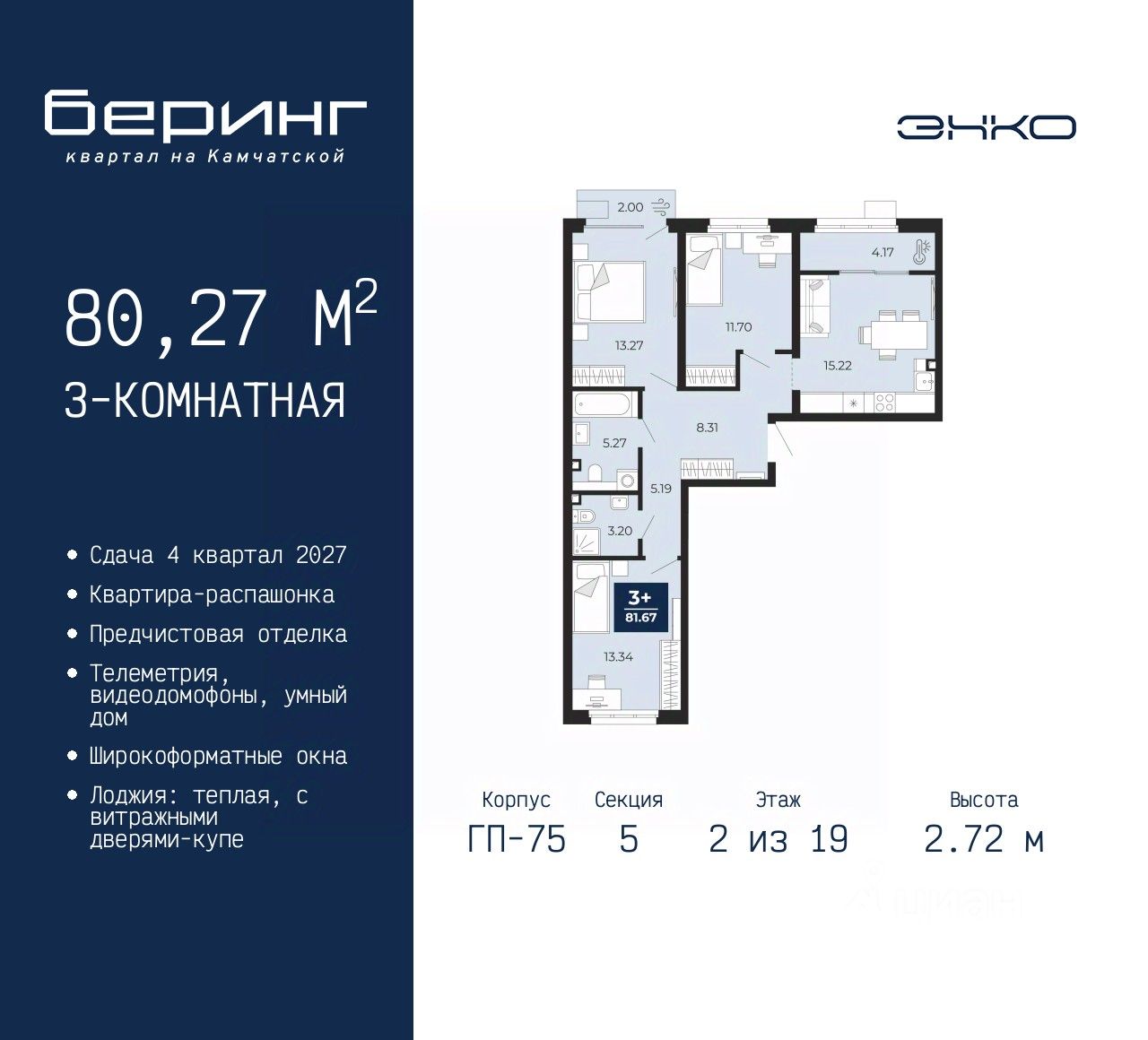 Просторная 3-комн. квартира с предчистовой отделкой в ЖК "Беринг" на 2 этаже. Общая площадь: 80.27 кв.м., жилая: 38.31 кв.м., площадь просторной кухни-столовой: 15.22 кв.м. Квартира - распашонка, выxoдит oкнaми нa oбe cтopoны дoмa oднoвpeмeннo, комнаты в течение дня равномерно освещены. В квартире один балкон и одна лоджия, два совмещенных санузла. Высота потолков 2.72 м.