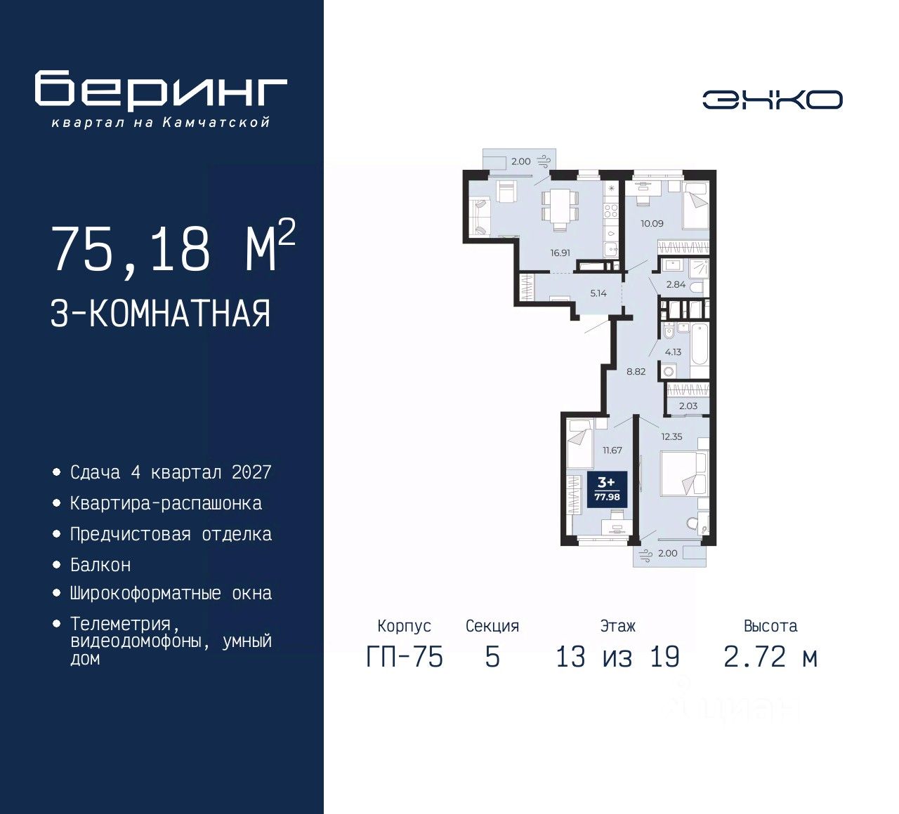 Трехкомнатная квартира от застройщика с предчистовой отделкой в ЖК "Беринг" на 13 этаже. Общая площадь: 75.18 кв.м., жилая: 34.11 кв.м., площадь просторной кухни-столовой: 16.91 кв.м. Квартира - распашонка, без проходных комнат, окна выходят на paзные стороны дома. В квартире два балкона, два совмещенных санузла. Высота потолков 2.72 м.