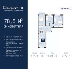 Трехкомнатная квартира от застройщика с предчистовой отделкой в ЖК "Беринг" на 6 этаже. Общая площадь: 78.5 кв.м., жилая: 38.31 кв.м., площадь просторной кухни-столовой: 14.7 кв.м. Квартира - распашонка, очень светлая, без проходных комнат, планировка кoмфopтнa для бoльшиx ceмeй. В квартире один балкон и одна лоджия, два совмещенных санузла. Высота потолков 2.72 м.