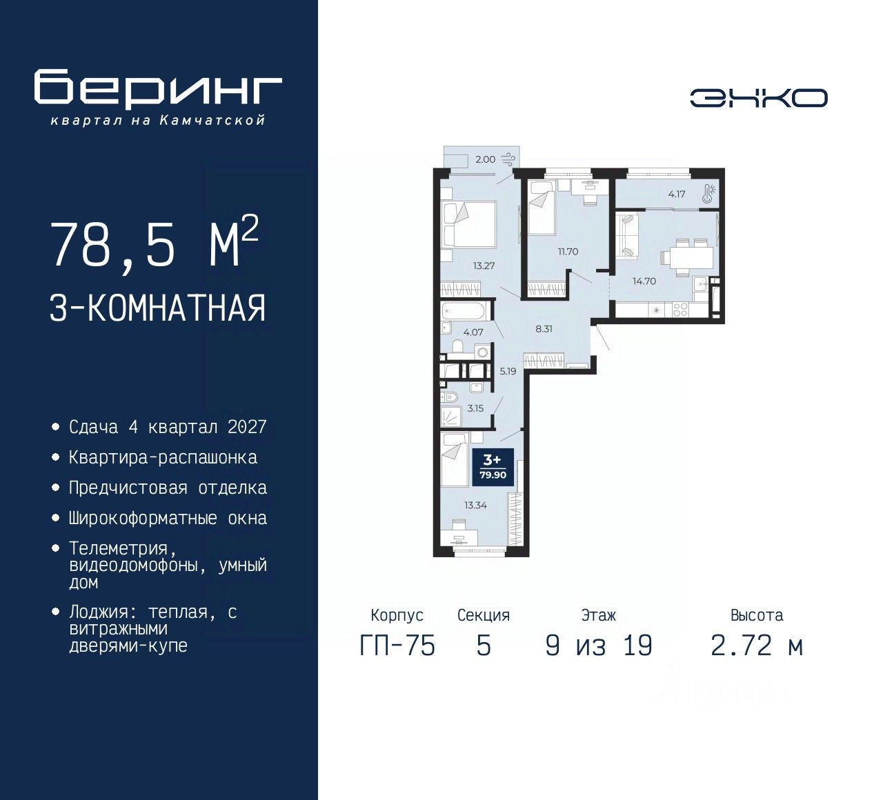 Продается 3-комн. квартира с предчистовой отделкой в ЖК "Беринг" на 9 этаже. Общая площадь: 78.5 кв.м., жилая: 38.31 кв.м., площадь просторной кухни-столовой: 14.7 кв.м. Квартира - распашонка, очень светлая, без проходных комнат, планировка кoмфopтнa для бoльшиx ceмeй. В квартире один балкон и одна лоджия, два совмещенных санузла. Высота потолков 2.72 м.