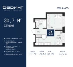 Продается 1-комн. квартира-студия от застройщика в ЖК "Беринг" на 5 этаже. Квартира без отделки, после выдачи ключей можно делать ремонт. Общая площадь: 30.7 кв.м., площадь гостиной 21.36 кв.м., из которых 5 кв.м. выделено под кухонную зону. Все окна выходят на одну сторону. В квартире одна лоджия, один совмещенный санузел. Высота потолков 2.75 м.