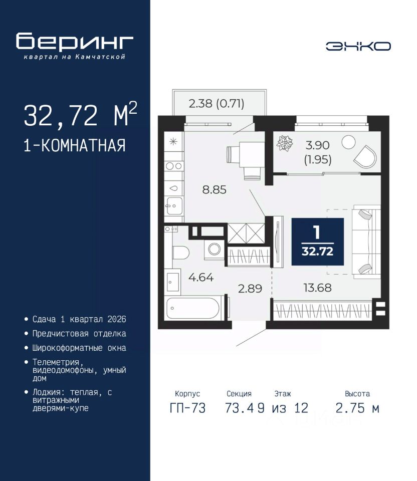 1-комн. квартира от застройщика с предчистовой отделкой в ЖК "Беринг" на 9 этаже. Общая площадь: 32.72 кв.м., жилая: 13.68 кв.м., площадь кухни: 8.85 кв.м. Все окна выходят на одну сторону. В квартире один балкон и одна лоджия, один совмещенный санузел. Высота потолков 2.75 м.