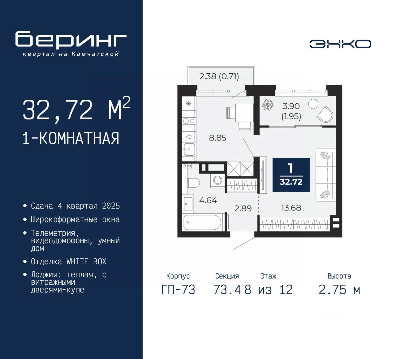 Продается 1-комн. квартира от застройщика в ЖК "Беринг" на 8 этаже. Квартира без отделки, новый владелец может сделать ремонт по своему проекту. Общая площадь: 32.72 кв.м., жилая: 13.68 кв.м., площадь кухни: 8.85 кв.м. Все окна выходят на одну сторону. В квартире один балкон и одна лоджия, один совмещенный санузел. Высота потолков 2.75 м.