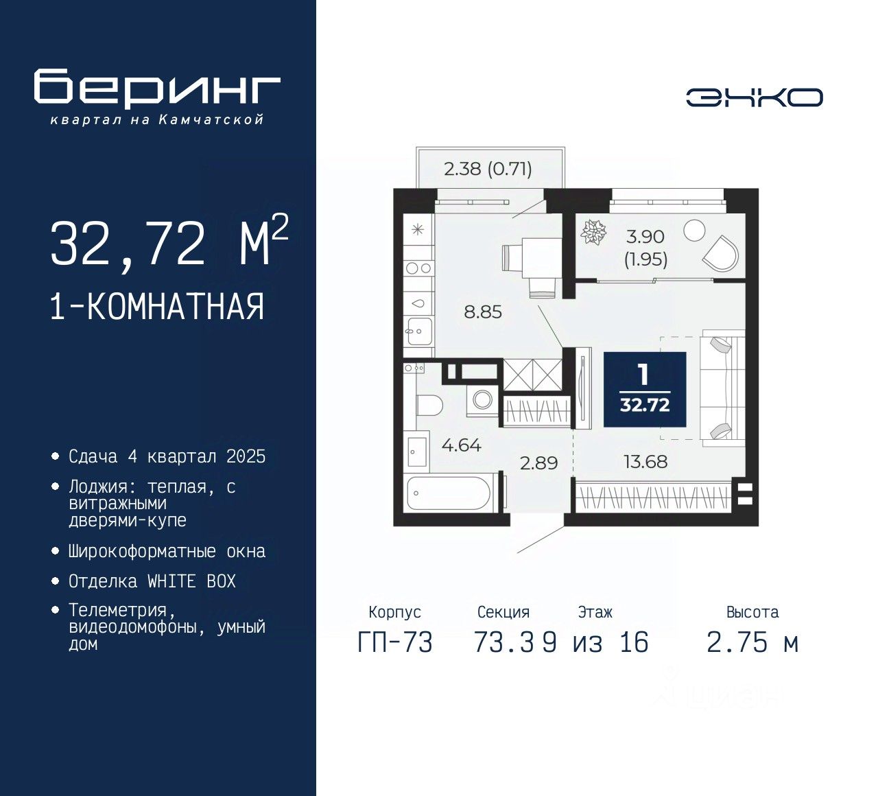 Однокомнатная квартира от застройщика в ЖК "Беринг" на 9 этаже. Квартира без отделки, после оформления собственности можно делать ремонт. Общая площадь: 32.72 кв.м., жилая: 13.68 кв.м., площадь кухни: 8.85 кв.м. Все окна выходят на одну сторону. В квартире один балкон и одна лоджия, один совмещенный санузел. Высота потолков 2.75 м.