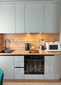 Кухня, выполненная на заказ, оснащена встроенной техникой Gorenie (варочная панель, духовой шкаф, вытяжка), холодильником и микроволновой печью.