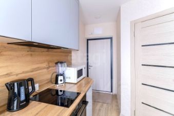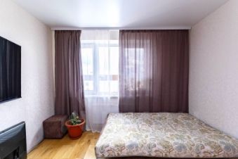 В спальне уложен натуральный паркет, увеличенное окно обеспечивает хорошую инсоляцию и вид на закрытый двор. Санузел отделан керамической плиткой, потолки во всей квартире — натяжные с трековыми светильниками.