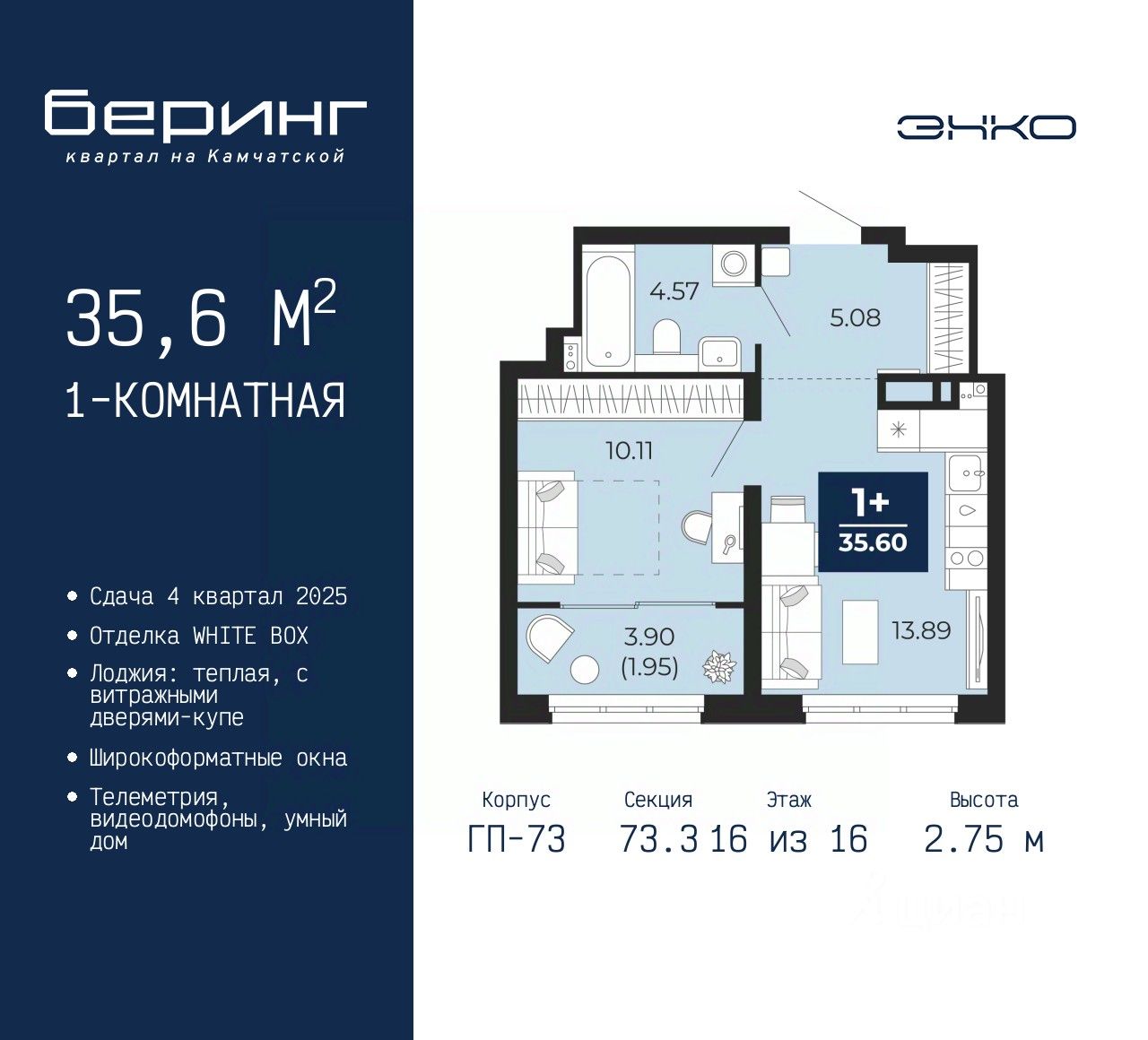 Просторная 1-комн. квартира с предчистовой отделкой в ЖК "Беринг" на 16 этаже. Общая площадь: 35.6 кв.м., жилая: 10.11 кв.м., площадь просторной кухни-столовой: 13.89 кв.м. Все окна выходят на одну сторону. В квартире одна лоджия, один совмещенный санузел. Высота потолков 2.75 м.