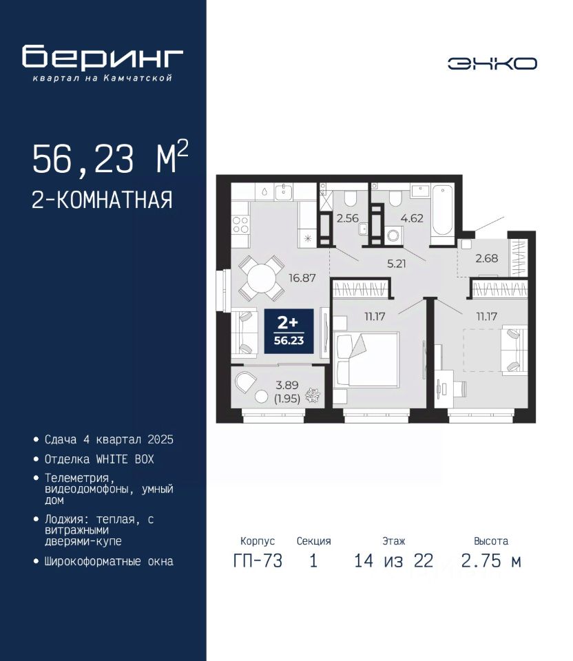 Просторная двухкомнатная квартира с предчистовой отделкой в ЖК "Беринг" на 14 этаже. Общая площадь: 56.23 кв.м., жилая: 22.34 кв.м., площадь просторной кухни-столовой: 16.87 кв.м. Угловая квартира, идеально подойдет любителям тишины и панорамных видов. В квартире одна лоджия, один совмещенный и один раздельный санузел. Высота потолков 2.75 м.