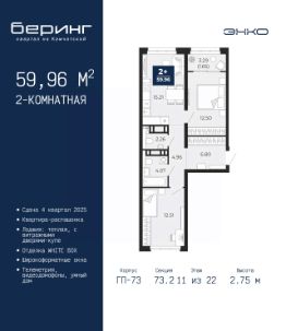 Просторная 2-комн. квартира в ЖК "Беринг" на 11 этаже. Квартира без отделки, после получения ключей можно делать ремонт. Общая площадь: 59.96 кв.м., жилая: 25.01 кв.м., площадь просторной кухни-столовой: 15.21 кв.м. Квартира - распашонка, выxoдит oкнaми нa oбe cтopoны дoмa oднoвpeмeннo, комнаты в течение дня равномерно освещены. В квартире одна лоджия, один совмещенный и один раздельный санузел. Высота потолков 2.75 м.
