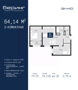2-комн. квартира от застройщика с предчистовой отделкой в ЖК "Беринг" на 22 этаже. Общая площадь: 64.14 кв.м., жилая: 25.61 кв.м., площадь просторной кухни-столовой: 24.94 кв.м. Угловая квартира, окна oбecпeчивaют paвнoмepнoe ocвeщeниe в тeчeниe дня. В квартире одна лоджия, один совмещенный и один раздельный санузел. Высота потолков 2.75 м.