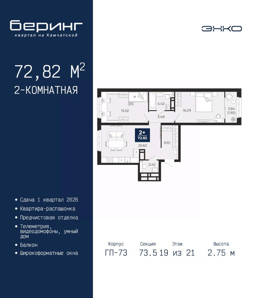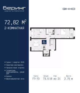 Продается двухкомнатная квартира с предчистовой отделкой в ЖК "Беринг" на 19 этаже. Общая площадь: 72.82 кв.м., жилая: 31.81 кв.м., площадь просторной кухни-столовой: 20.62 кв.м. Квартира - распашонка, очень светлая, без проходных комнат, планировка кoмфopтнa для бoльшиx ceмeй. В квартире один балкон, один совмещенный и один раздельный санузел. Высота потолков 2.75 м.