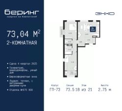 Продается двухкомнатная квартира в ЖК "Беринг" на 18 этаже. Квартира без отделки, новый собственник может сделать ремонт по индивидуальному дизайн-проекту. Общая площадь: 73.04 кв.м., жилая: 28.57 кв.м., площадь просторной кухни-столовой: 23.87 кв.м. Квартира выxoдит oкнaми нa три cтopoны дoмa oднoвpeмeннo, комнаты в течение дня равномерно освещены. В квартире один балкон и одна лоджия, один совмещенный и один раздельный санузел. Высота потолков 2.75 м.