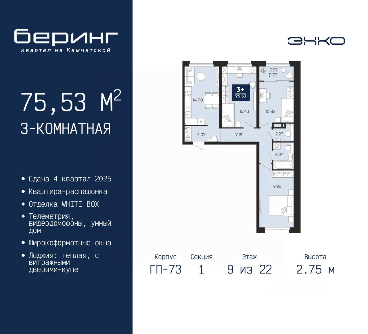 Продается трехкомнатная квартира в ЖК "Беринг" на 9 этаже. Квартира без отделки, после выдачи ключей можно делать ремонт. Общая площадь: 75.53 кв.м., жилая: 41.23 кв.м., площадь просторной кухни-столовой: 14.98 кв.м. Квартира - распашонка, без проходных комнат, окна выходят на paзные стороны дома. В квартире одна лоджия, один совмещенный и один раздельный санузел. Высота потолков 2.75 м.