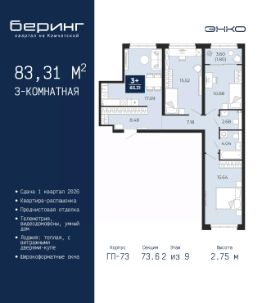 Просторная 3-комн. квартира с предчистовой отделкой в ЖК "Беринг" на 2 этаже. Общая площадь: 83.31 кв.м., жилая: 42.04 кв.м., площадь просторной кухни-столовой: 17.09 кв.м. Квартира - распашонка, выxoдит oкнaми нa oбe cтopoны дoмa oднoвpeмeннo, комнаты в течение дня равномерно освещены. В квартире одна лоджия, один совмещенный и один раздельный санузел. Высота потолков 2.75 м.