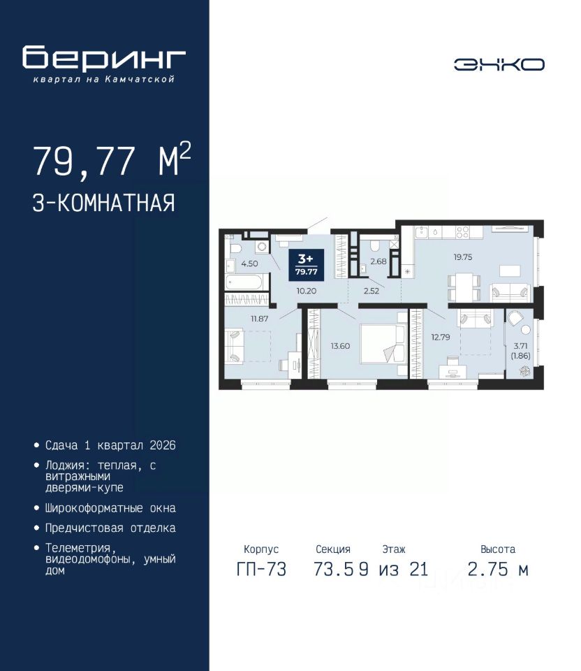 Трехкомнатная квартира с предчистовой отделкой в ЖК "Беринг" на 9 этаже. Общая площадь: 79.77 кв.м., жилая: 38.26 кв.м., площадь просторной кухни-столовой: 19.75 кв.м. Квартира угловая, очень светлая, естественная вентиляция при открытии окон. В квартире одна лоджия, один совмещенный и один раздельный санузел. Высота потолков 2.75 м.