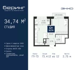 1-комн. квартира-студия от застройщика в ЖК "Беринг" на 12 этаже. Квартира без отделки, полностью готова к ремонту. Общая площадь: 34.74 кв.м., площадь гостиной 25.22 кв.м., из которых 5 кв.м. выделено под кухонную зону. Все окна выходят на одну сторону. В квартире один балкон, один совмещенный санузел. Высота потолков 2.75 м.