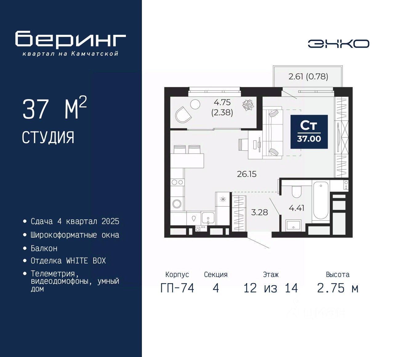 1-комн. квартира-студия в ЖК "Беринг" на 12 этаже. Квартира без отделки, новый владелец может сделать ремонт по индивидуальному проекту. Общая площадь: 37 кв.м., площадь гостиной 26.15 кв.м., из которых 5 кв.м. выделено под кухонную зону. Все окна выходят на одну сторону. В квартире один балкон, один совмещенный санузел. Высота потолков 2.75 м.