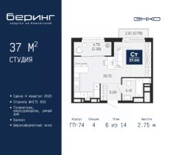 Однокомнатная квартира-студия в ЖК "Беринг" на 6 этаже. Квартира без отделки, после получения ключей можно делать ремонт. Общая площадь: 37 кв.м., площадь гостиной 26.15 кв.м., из которых 5 кв.м. выделено под кухонную зону. Все окна выходят на одну сторону. В квартире один балкон, один совмещенный санузел. Высота потолков 2.75 м.